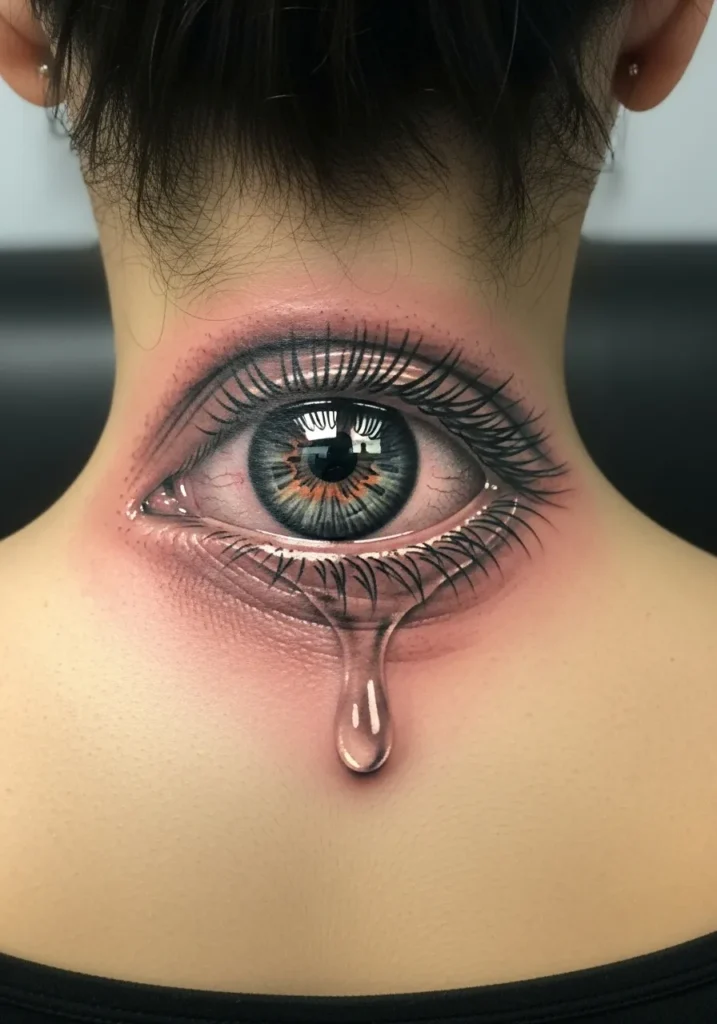 This hyper-realistic tattoo of an eye sits on the back of the neck, complete with reflections, fine lashes, and a single tear rolling down. The shading adds lifelike depth, making it look almost photographic. The surrounding skin tones blend seamlessly into the natural complexion.