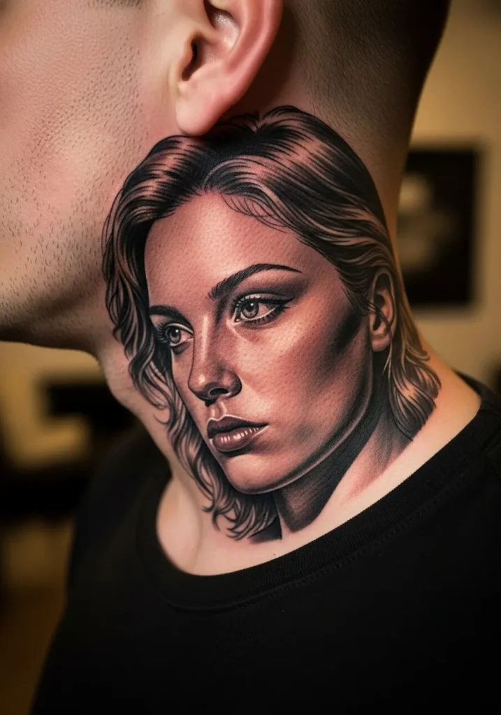 This striking realism tattoo depicts a woman s face inked along the side of the neck with smooth shading and soft tones that mimic natural skin texture. Her expression is calm yet intense, giving the piece a soulful depth. Every strand of hair and eyelash has been carefully rendered to perfection.