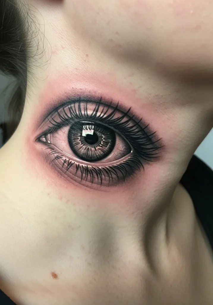 This neck tattoo showcases an incredibly lifelike human eye, complete with detailed lashes, reflections, and subtle pink shading around the edges. The precision of the iris gives it an uncanny realism that makes it almost feel like it s watching. The design s size fits neatly on the side of the neck, drawing instant attention.