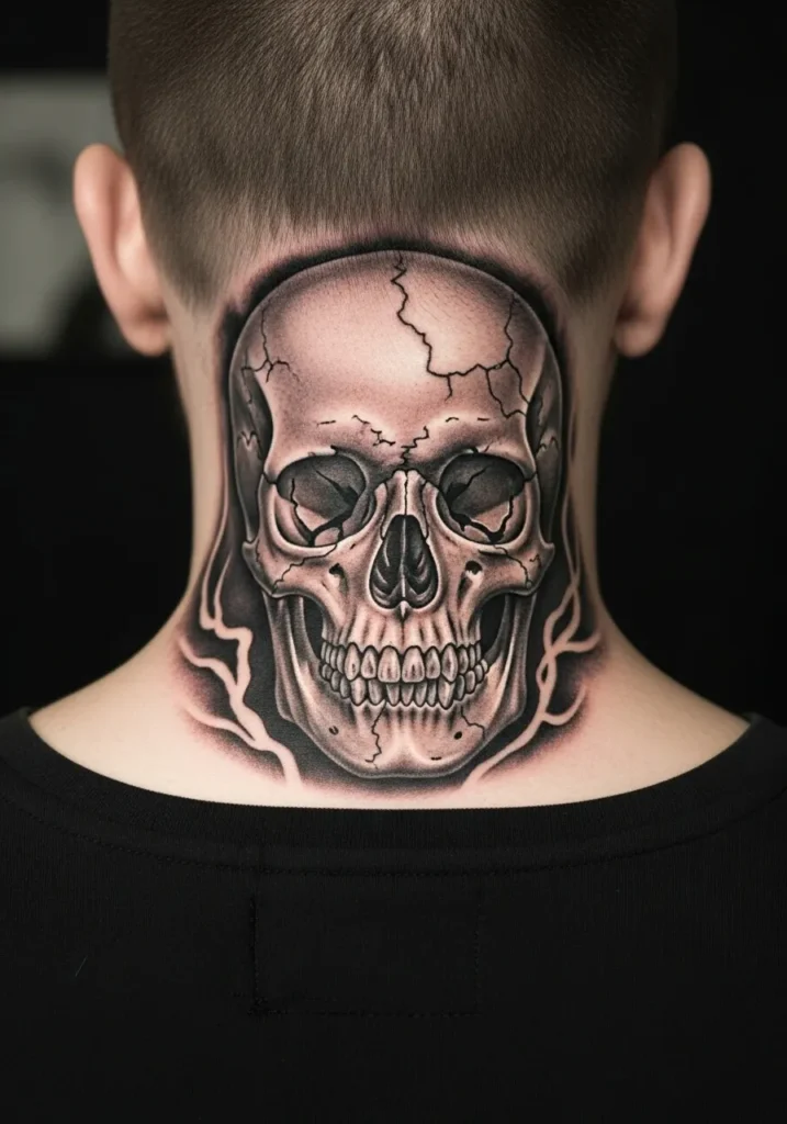 This bold black and grey realism tattoo features a detailed skull covering the entire back of the neck. The cracked textures and smooth shading create a hauntingly realistic effect. The skull s hollow eyes and slight shadowing make it look almost three-dimensional, adding drama and intensity to the design.