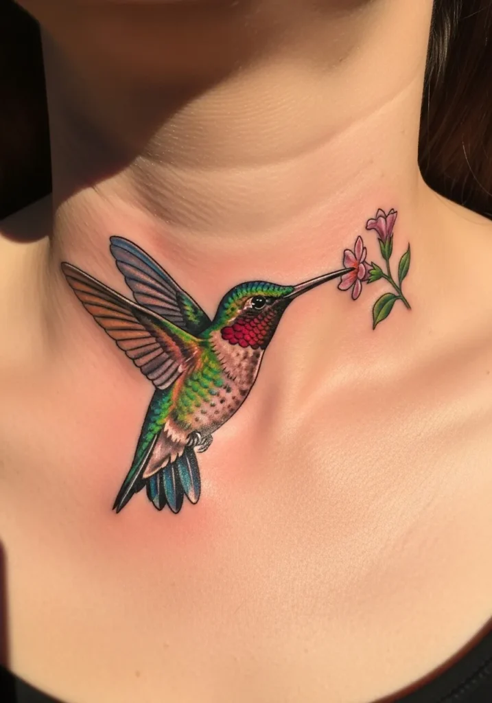 This vibrant realism tattoo features a colorful hummingbird in flight at the center of the neck, reaching toward a small pink flower. The detailing in the feathers shows a stunning mix of green, blue, and gold tones that shimmer under the light. The placement along the collarbone enhances its delicate motion, making it look like the bird is hovering just above the skin.