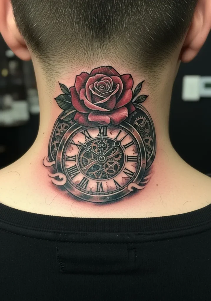This neck tattoo combines the realism of a blooming red rose with the intricate gears of a vintage pocket watch. The soft petals contrast beautifully with the mechanical details of the clock, complete with Roman numerals and precise linework. The shading adds a sense of timeless elegance.