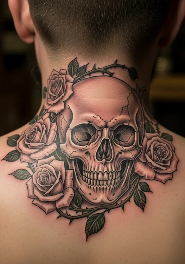 This bold tattoo covers the back of the neck with a realistic skull surrounded by blooming roses and thorny vines. The shading creates a beautiful depth, with the soft petals contrasting against the detailed cracks of the skull. The use of muted pinks and greys makes the design feel both dark and elegant.