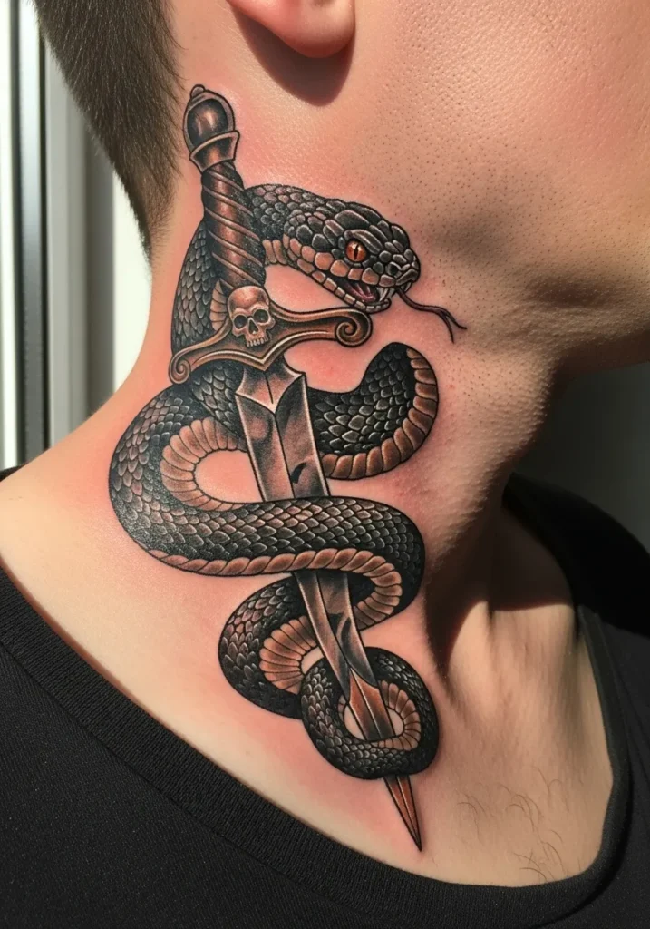 This striking neck tattoo shows a black and grey snake coiled around a sharp dagger, its scales glistening with precise shading. A small skull detail on the dagger s handle adds an extra touch of intensity. The positioning from the jawline down to the collarbone gives the piece a sleek, flowing movement.