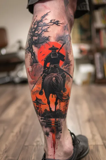 This dramatic leg piece showcases a samurai riding horseback, captured in full armor and framed against a blazing red sun. The background blends smoky grays with fiery orange hues that spill down the calf like glowing embers. A leafless tree creeps from the side, while traditional Japanese temples sit low in the distance, creating an epic sense of scale. The details in the samurai s armor and the silhouette of the horse are sharp, bold, and absolutely striking.