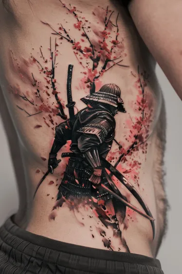 This bold side tattoo shows a powerful samurai mid-turn, dressed in full traditional armor with his katana ready to strike. Behind him, cherry blossom branches explode in a mix of red splashes and black ink lines, adding a dynamic burst of energy to the entire piece. The detail in the armor is super sharp and textured, while the background feels like an abstract painting layered behind him. It s a perfect mix of strength and artistry, flowing beautifully along the shape of the ribs.