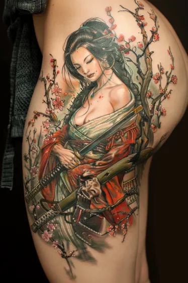 Cherry Blossom Samurai Woman Thigh Tattoo