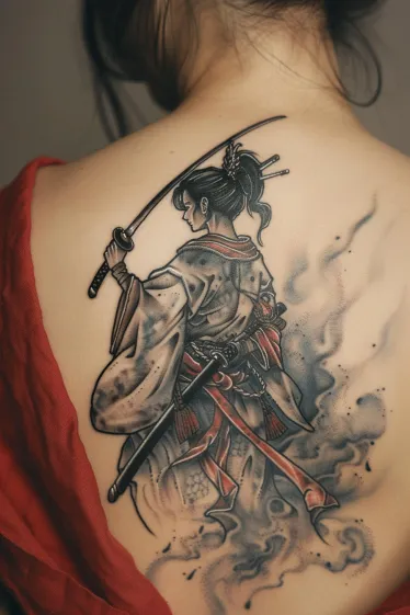 This elegant back tattoo features a graceful female samurai in traditional robes, katana raised and ready, with her hair tied up in a stylish bun. The design uses mostly soft black and grey tones, accented with striking red details in the fabric and accessories, giving it a perfectly balanced look between subtlety and strength. There s a dreamy smoky texture behind her that adds depth and softness, almost like she s stepping out of mist and into a moment of action.