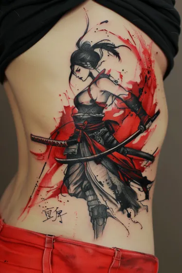 This striking rib tattoo features a fierce female samurai mid-movement, her katana ready and her posture exuding unstoppable confidence. The color palette is bold with intense reds splashed across the background, giving it that dramatic, watercolor explosion look. Her armor and outfit have just the right amount of detail without going overboard, and those sharp ink strokes give it a dynamic, almost animated feel. Every line feels alive, as if she s about to leap right off the skin.