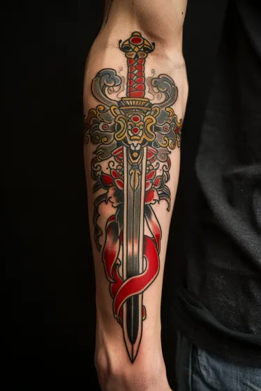 This bold forearm tattoo showcases a stunning samurai sword in a vibrant neo traditional style. The blade is long and symmetrical, with intricate gold detailing near the hilt and a deep red handle that really pops against the skin. A swirling red ribbon wraps around the sword, adding movement and contrast while giving the design a dramatic, almost ceremonial look. The clouds in the background are classic neo traditional with those soft curls and muted grays, helping the sword stand out as the clear centerpiece.