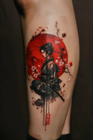 This gorgeous tattoo features a poised samurai woman kneeling calmly in front of a vivid red sun, framed by delicate cherry blossoms. The design blends traditional Japanese elements with an artsy, modern twist. Her kimono is filled with fine linework, and the soft shading adds a beautiful sense of depth. The deep crimson circle behind her makes everything pop, while little black ink splatters and paint-like drips give the whole thing a touch of that edgy watercolor vibe.