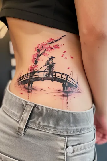 This side tattoo is such a soft yet powerful design. It shows a lone samurai standing on a curved wooden bridge, with cherry blossom petals drifting around him like delicate confetti. The tree in the background is minimal and dreamy, and the whole scene feels peaceful, almost like a still from a watercolor animation. The fine lines and light pink hues give it that clean, graceful aesthetic that pairs beautifully with the natural flow of the waist and ribs.