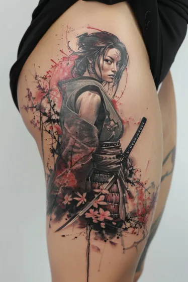 This stunning thigh tattoo features a fierce female samurai standing with confidence, wrapped in soft shadows and bold lines that make the entire design feel alive. The style blends realism with watercolor splashes in pink and black, adding an edgy yet artistic flair. Cherry blossoms bloom around the base, giving it a beautifully feminine contrast to the tough armor and strong stance. The composition is clean but full of emotion, with every element flowing naturally with the curves of the thigh.