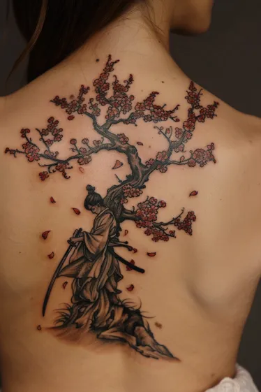 This soft and graceful back tattoo features a peaceful samurai kneeling beneath a blooming cherry blossom tree. The petals are scattered in the air, giving the whole piece a delicate sense of movement. The branches of the tree stretch beautifully across the upper back, wrapping around the figure like a quiet moment of stillness and strength. The samurai s pose is humble, with her head slightly bowed, while her robe flows naturally with the lines of her body.