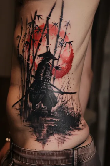 This ribcage tattoo features a lone samurai standing poised among tall, shadowy bamboo stalks, with a bold red sun splashed behind him like a dramatic watercolor. The contrast between the dark ink and the bursts of red creates such a raw, emotional mood. The brushstroke-inspired style makes everything feel like it s been painted directly onto the skin, full of movement and intensity. And the placement? Absolutely perfect for the long vertical flow of the scene.