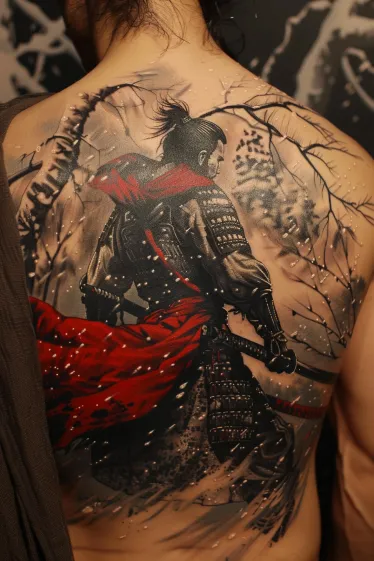 This intense full back tattoo shows a fearless samurai mid-stride through a snowy forest, his long red cape flowing wildly behind him. Every detail is sharp and dramatic, from the heavy armor and katana to the gusts of wind swirling through the bare winter trees. The contrast between the black and gray shading and that bold splash of red makes the whole design look like it s straight out of a graphic novel. It wraps across the entire back like a complete battle scene frozen in time.