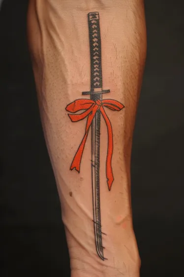 This sweet and striking tattoo features a lone katana inked vertically along the forearm, tied delicately with a flowing red bow. The design is super clean with crisp lines and minimal shading, which gives it a slightly playful but still powerful feel. The contrast between the fierce blade and the soft ribbon is what makes this one so unique. It s bold, simple, and honestly a little sassy in the best way.