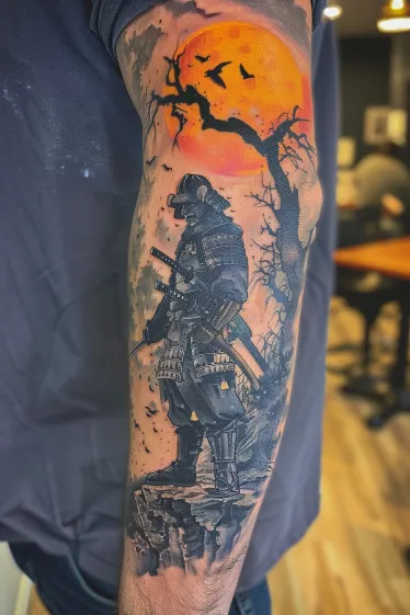 Samurai Warrior Sleeve Tattoo With Orange Moon