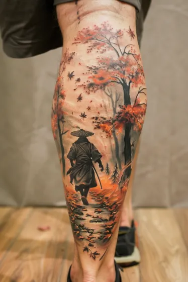 I think this one is absolutely magical. It s got that quiet strength vibe, like the samurai s not out to fight but to reflect and just exist with nature. The way the colors blend into the skin makes the whole thing look like a painting on a canvas, and I love that it stretches the full length of the calf. It s such a poetic piece, and honestly, it kind of makes me want to book a trip to Japan and wander through maple trees in silence. Total zen mood.