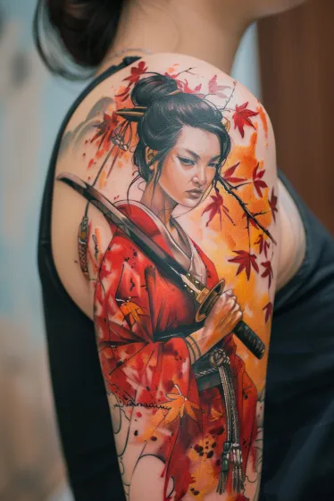 This striking upper arm tattoo features a fierce female samurai in a flowing red kimono, framed by delicate maple leaves falling all around her. The color work is absolutely dreamy, with rich reds and warm oranges blending into a glowing watercolor-style background. Her gaze is intense, like she s fully aware of her power and doesn t need to prove it to anyone. The details in the katana, her hair, and the textures of her clothing give the whole design a painted, almost cinematic feel.