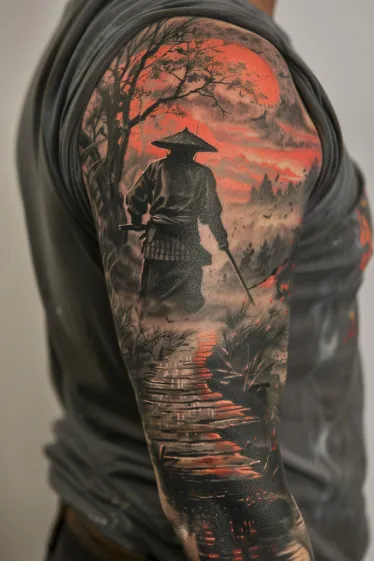 This dramatic sleeve tattoo shows a lone samurai walking along a misty path with his sword at the ready, surrounded by eerie trees and glowing reflections on the water. The whole scene is bathed in deep red hues from a massive setting sun that fills the background with an almost otherworldly warmth. The grayscale details in the samurai s armor and the trees contrast beautifully with the fiery sky and water, giving it a haunting, cinematic vibe that wraps perfectly around the arm.
