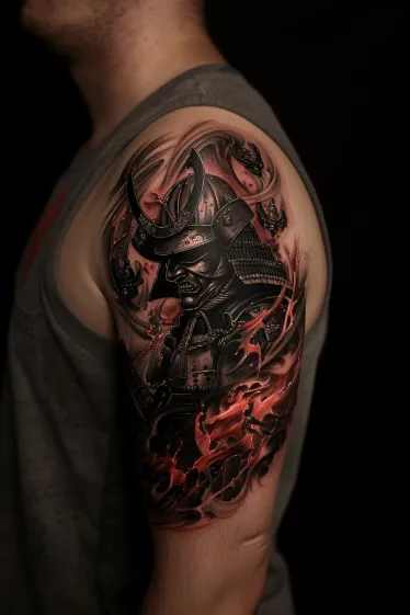 This powerful upper arm tattoo features a menacing samurai warrior in full armor, surrounded by swirling flames in bold shades of red and orange. The helmet is incredibly detailed, with sharp horns and an intense expression that feels ready for battle. The contrast between the shiny black armor and the fiery background gives this design a wild, unstoppable energy. It s packed with movement, drama, and seriously fierce vibes.