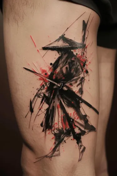 This bold thigh tattoo takes a totally artistic spin on the samurai theme with a loose, ink-brush style that looks straight off a canvas. The figure of the samurai is sketched out in deep black strokes, with sharp splashes of red that give it an intense, battle-worn vibe. You can see the iconic conical hat and katana, but everything else flows in a blur of motion and shadow, like the warrior is stepping out of a dream or disappearing into smoke. It s abstract but still packed with presence.