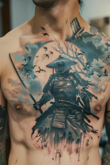 This bold full chest tattoo features a lone samurai in detailed black and gray armor, standing under a haunting full moon with a katana in hand. The background is filled with silhouettes of flying birds and barren tree branches, adding a touch of mystery and drama. There s this amazing smoky texture around the edges that makes the whole scene feel like it s emerging from another world. The shading is so smooth and the way the artist worked in the shadows on the armor is just next-level.