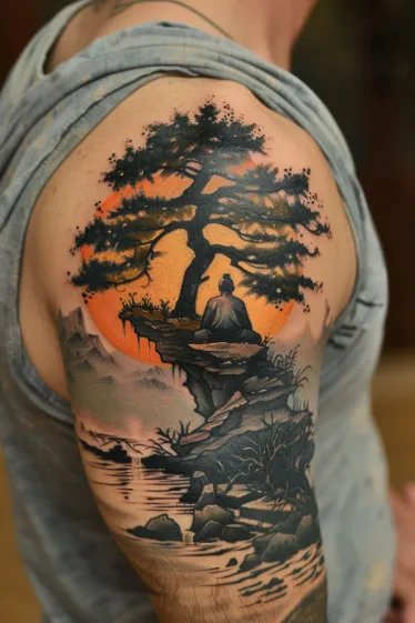 This peaceful shoulder tattoo features a lone samurai sitting beneath a tall, wind-swept pine tree on a rocky cliff, gazing out across a still lake. The scene is lit by a glowing orange sun that fills the background with warmth, casting a golden hue over the whole design. The textures are beautifully detailed, from the ripples in the water to the shadows under the tree. It has this serene, almost storybook feeling, like a moment frozen in perfect stillness.