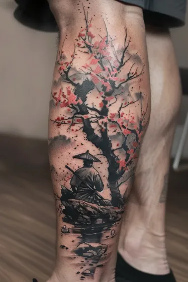 This gorgeous calf tattoo features a peaceful samurai sitting on a rocky ledge beneath a blooming cherry blossom tree. The soft red petals fall gently through the air, adding a delicate contrast to the grayscale tones of the samurai and tree. The reflection in the water below adds a dreamy, tranquil element that ties the whole piece together beautifully. Everything about it feels thoughtful and serene, like a moment of quiet solitude frozen in time.
