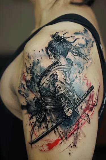This stunning shoulder tattoo features a graceful yet fierce female samurai, captured in a powerful side pose with her katana at the ready. The artwork is filled with dynamic movement, from the loose strands of hair to the flowing kimono that wraps around her body. There s this gorgeous mix of black and grey ink with splashes of red that add emotion and depth without overpowering the piece. The watercolor-inspired background almost looks like swirling smoke or ink, giving the entire tattoo an ethereal and artistic vibe.