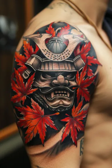 Samurai Mask with Red Maple Leaves Arm Tattoo