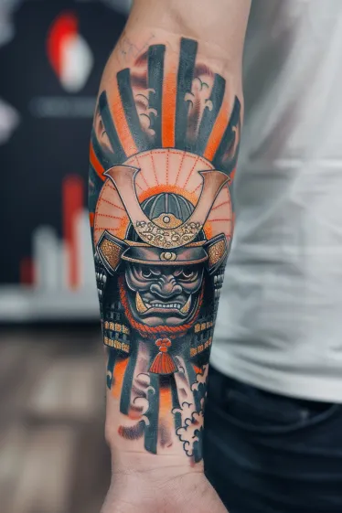This striking forearm tattoo features a fierce samurai mask in a bold neo traditional style, complete with rich golden armor details and glowing orange rays radiating from behind. The mask has intense expression and sharp features, surrounded by stylized clouds and black and orange stripes that create a dramatic, almost sunburst-like background. The symmetry and color palette make everything pop with power and precision, giving the design a high-impact look that feels both modern and deeply rooted in tradition.