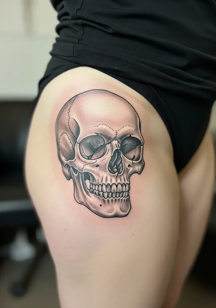 This upper thigh skull tattoo is beautifully bold, featuring smooth black and grey shading across the dome and jawline. The size gives the artist plenty of room to add detail, from the cracks on the skull to the shadows in the eye sockets. The placement on the thigh makes it both powerful and intimate, and the soft shading blends effortlessly into the skin.