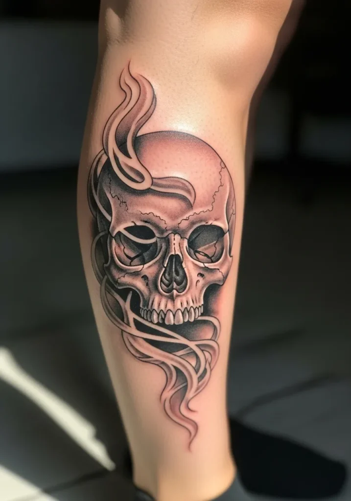 This calf tattoo showcases a realistic skull wrapped in flowing, smoke like shapes that frame the design beautifully. The shading is soft and smooth, blending different tones of black and grey to give the skull dimension without overpowering the swirling accents. The placement along the calf allows the design to stretch naturally, giving the smoke a graceful movement that draws the eye downward. It is a medium sized piece that stands out without feeling too busy.