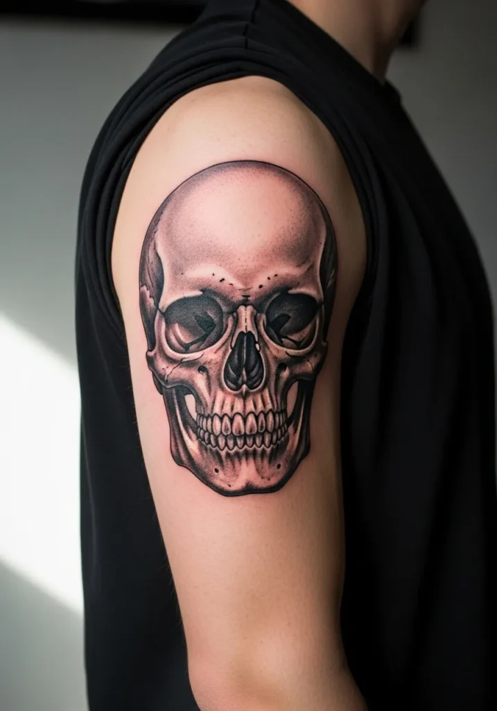 This upper arm tattoo features a large highly realistic skull with smooth gradient shading across the dome and cheekbones. The eye sockets are deep and shadowed giving it that intense traditional feel. The placement hugs the curve of the upper arm beautifully and the size makes it impossible to miss.