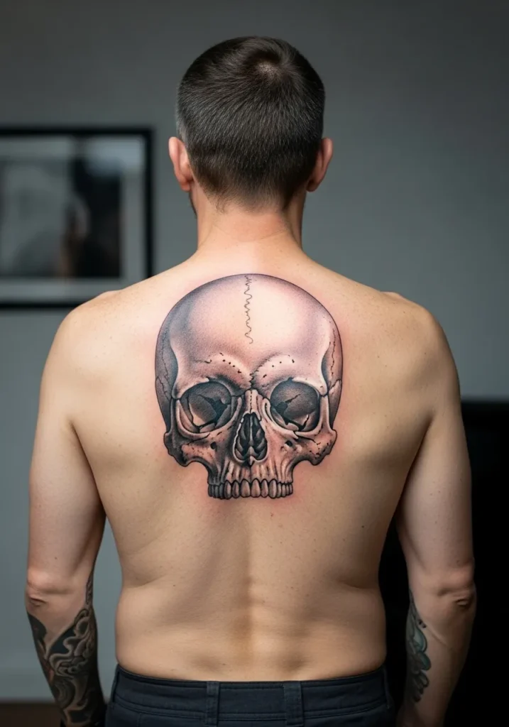 This upper back tattoo features a bold oversized skull placed right between the shoulder blades, giving it a strong and balanced presence. The shading moves smoothly from soft pinkish tones to deeper greys, creating a lifelike contour around the dome of the skull and emphasizing the dramatic shadows in the eye sockets and jaw. The clean linework gives it a crisp structure, and the size makes it instantly eye catching without feeling crowded on the skin.