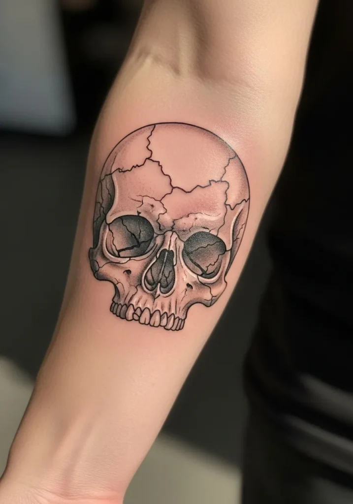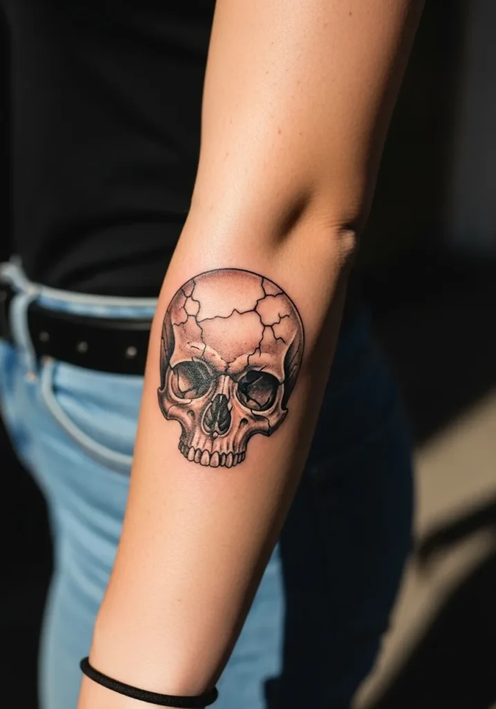 This inner forearm skull tattoo keeps things clean and bold with its compact size and beautifully realistic shading. The artist used soft black and grey tones to create smooth contours and natural cracks across the skull, giving it that worn and weathered look without feeling heavy. The placement on the forearm makes the design easy to show off, and the crisp linework keeps the entire piece feeling sharp and intentional. It is a classic skull brought to life with just enough detail to stay striking without overwhelming the space.