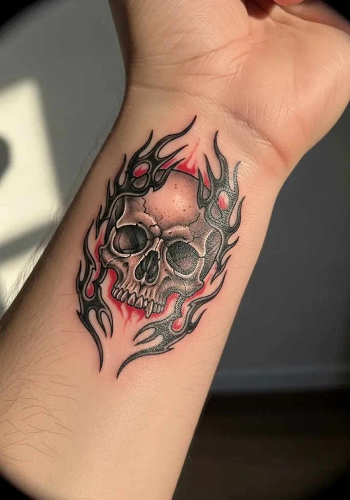 This wrist tattoo brings so much energy with its fiery black and red flame design wrapped around a detailed skull. The skull itself is shaded in soft greys with crisp contouring that gives it a bold, dimensional look, while the flames add a sharp graphic edge. The touches of red make the whole piece feel alive, and the placement on the wrist keeps it visible and full of attitude. It is small to medium in size but definitely commands attention.