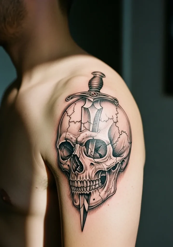 This shoulder tattoo features a bold skull pierced by a vertically placed dagger, creating a classic and powerful image. The shading uses deep blacks to highlight the cracks, teeth, and eye sockets, while the dagger brings in straight lines and metallic reflection. The placement on the upper arm makes the design look strong and structured, and the overall size is big enough to make a statement without taking over the entire arm.