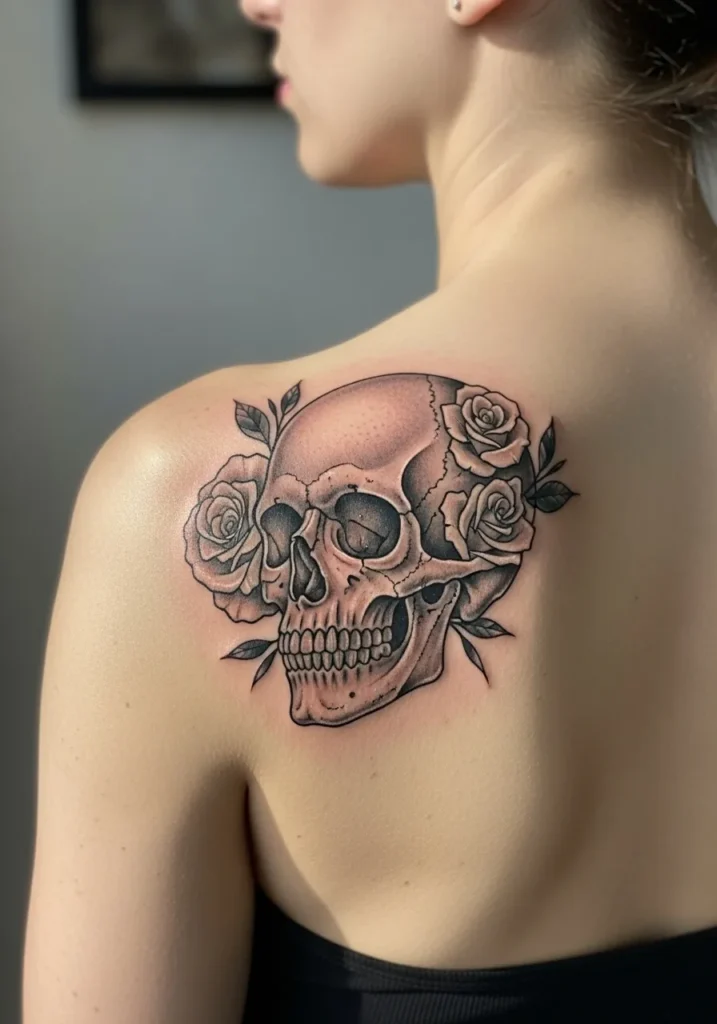 This shoulder blade tattoo brings together a detailed skull and beautifully shaded roses for a classic mix of grit and elegance. The black and grey shading highlights the cracked surface of the skull while the roses soften the overall look with their delicate petals and leaves. The placement on the upper back gives it room to breathe, allowing the tattoo to stretch naturally across the shoulder without feeling crowded.