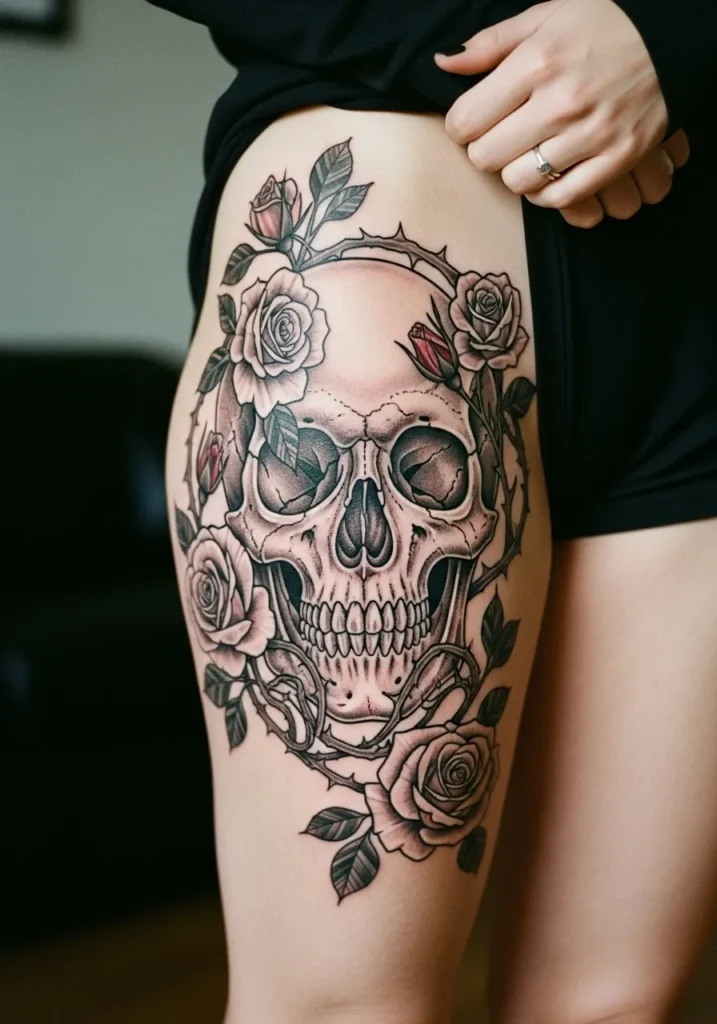 This thigh tattoo blends a large skull with beautifully shaded roses that frame the design on both sides. The black and grey shading adds softness to the flowers while keeping the skull bold and structured. The placement on the thigh allows the arrangement to stretch naturally and the combination of skulls and roses feels both romantic and edgy.
