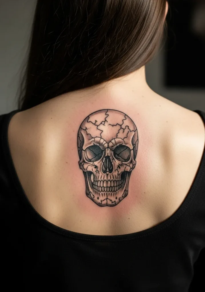 This upper back skull tattoo keeps things simple and structured with a clean black and grey design placed right along the spine. The shading highlights every contour of the skull with soft cracking details and deep shadows. The size is perfect for the upper back since it sits comfortably without stretching too wide across the shoulders.