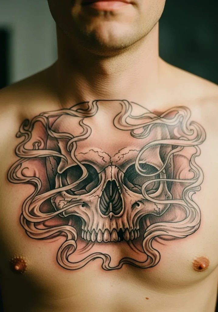 This chest tattoo features a large skull surrounded by swirling smoke shapes that spread beautifully across the upper torso. The shading is deep and dramatic, especially around the eyes and jaw, while the smoke curls create movement and flow across the chest. The placement makes it impossible to miss and the black and grey palette keeps it cohesive and intense without being overly dark.