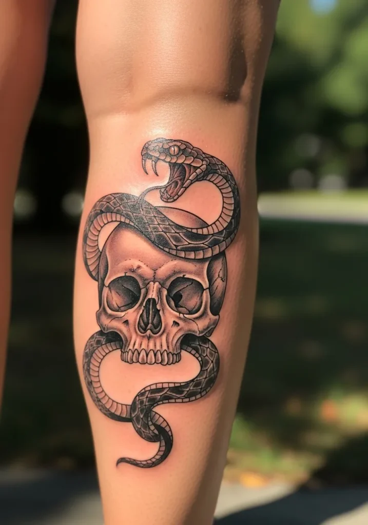 This calf tattoo pairs a realistic skull with a coiling snake that wraps around and through the design. The skull has smooth grey shading with defined cracks while the snake is heavily textured with scales and a striking open mouth. The placement on the calf gives the design room to flow naturally and the combination of skull and serpent creates a bold and dramatic effect.