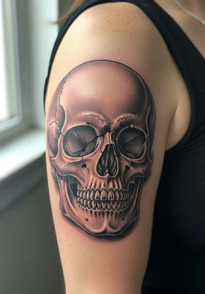 This upper arm tattoo features a bold and beautifully shaded skull that feels timeless and strong. The artist used smooth black and grey gradients to create depth in the eye sockets and along the jaw while keeping the dome of the skull soft and rounded. The cracks and tiny details make it feel incredibly lifelike and the placement hugs the curve of the arm in such a flattering way. It is a medium to large piece that stands out without overpowering the whole arm.