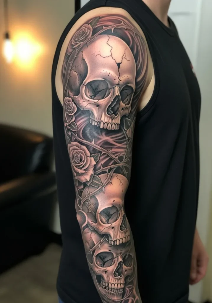 This full sleeve tattoo brings together skulls, roses, and swirling shadows in a dramatic black and grey design that covers the entire arm. The skulls vary in size and angle, giving the sleeve depth and movement, while the roses add softness and texture. The shading shifts from deep blacks to velvety greys, creating a layered look that feels dimensional and cohesive. It is a large scale piece that takes over the arm in the most powerful and artistic way.