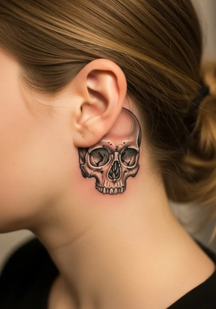 I love how delicate but fierce this placement feels. It is one of those tattoos that shows off your personality without screaming for attention. There s something so fun and stylish about a tiny skull peeking out from behind the ear and it has such a cute rebellious charm.