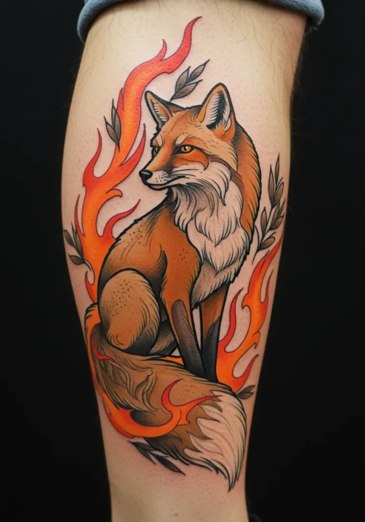 Fox and Fire Tattoo on Calf in Neo Traditional Style