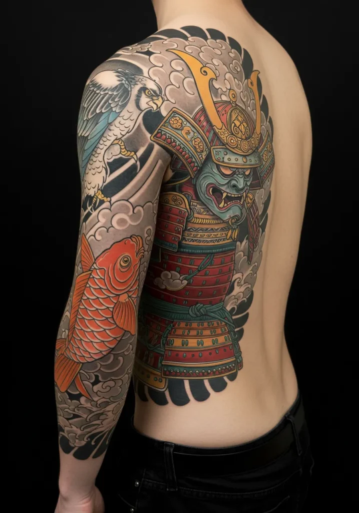 This tattoo is a full-blown masterpiece. Stretching from the back to the full arm, it blends traditional Japanese elements with incredible color and balance. The bright orange koi fish swims upward through smoky grey waves, symbolizing perseverance and strength. Above it, a sharp-eyed hawk soars in with its wings tucked in a striking pose. On the back, a fierce samurai in vivid red armor roars with blue skin and golden horns adding mythic energy to the whole composition.